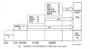 2017年ランセット委員会は以下に述べる10の因子が、どの程度認知症の発症に関わるかを調べました。その結果が以下の図1です。
