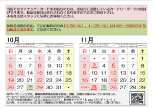 10月11月の診療カレンダーの診療カレンダーができましたのでご確認ください。
