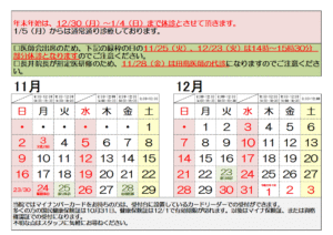 11月12月診療カレンダー 2025.11.4 10月11月の診療カレンダーができましたのでご確認ください。 PDF版はこちらからどうそ。 急に寒くなり体調を崩され方が増えております。くれぐれもご自愛ください。 デイケア[&you]ブログを更新しました前の記事